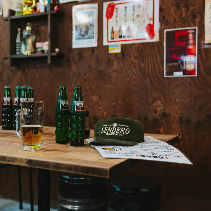 The "Logo" Hat features an unstructured 5-panel mid-profile build, an all-over olive corduroy material, an easy curve visor, a white embroidered logo design front panel, an internal pop-up mesh stay, a snapback for a one size fit, and the classic Sendero labels.