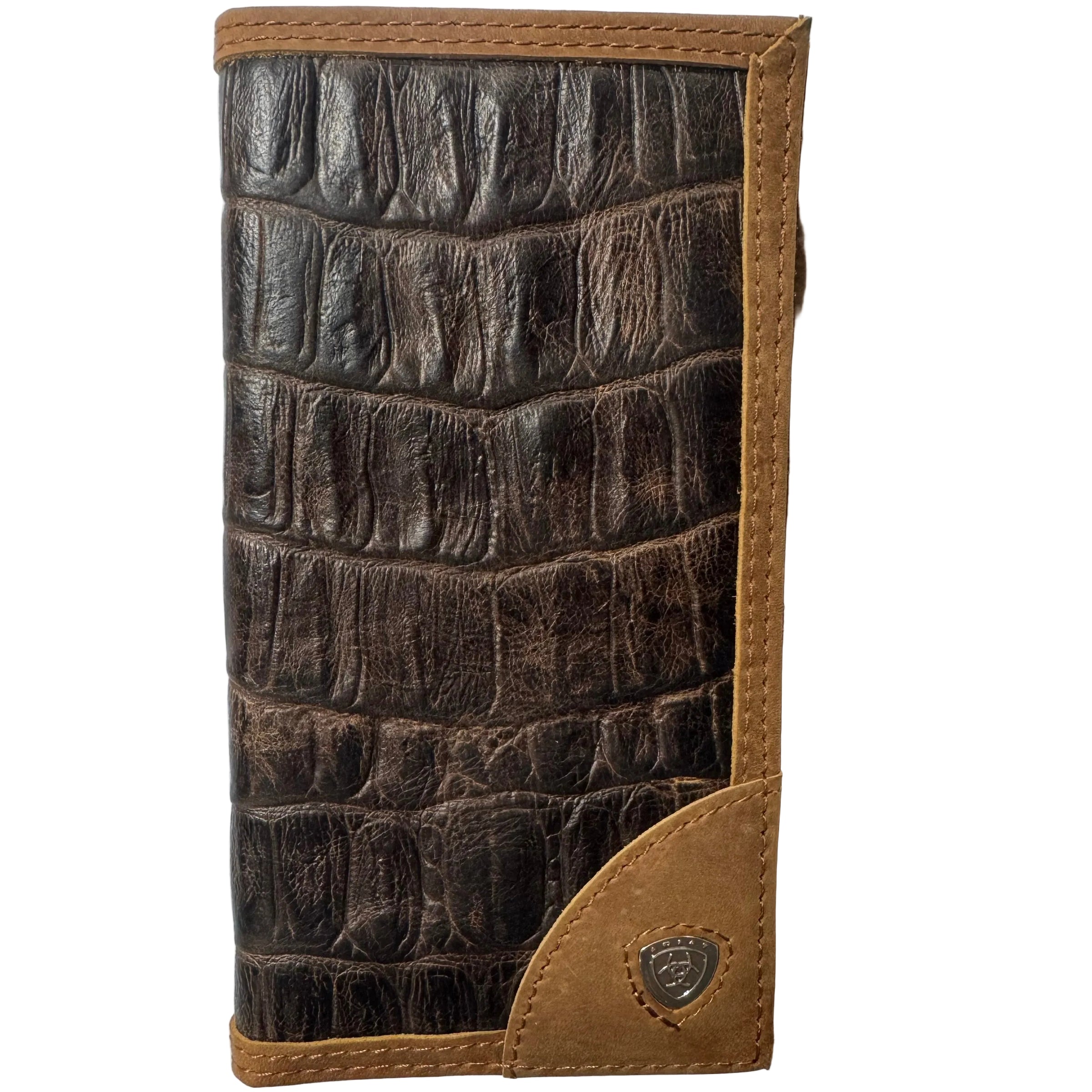 This leather Ariat rodeo wallet by M&F Western Products features faux crocodile leather with a lower corner tab and Ariat shield concho. Inside consists of credit card slots, money slots, and a place for your ID.