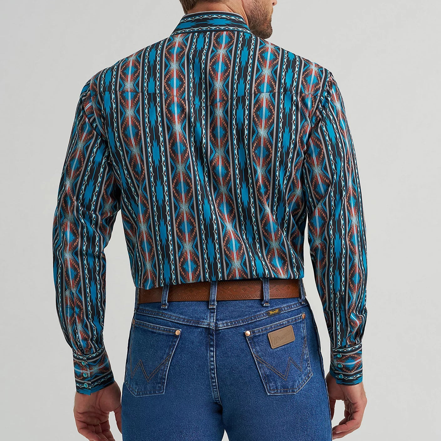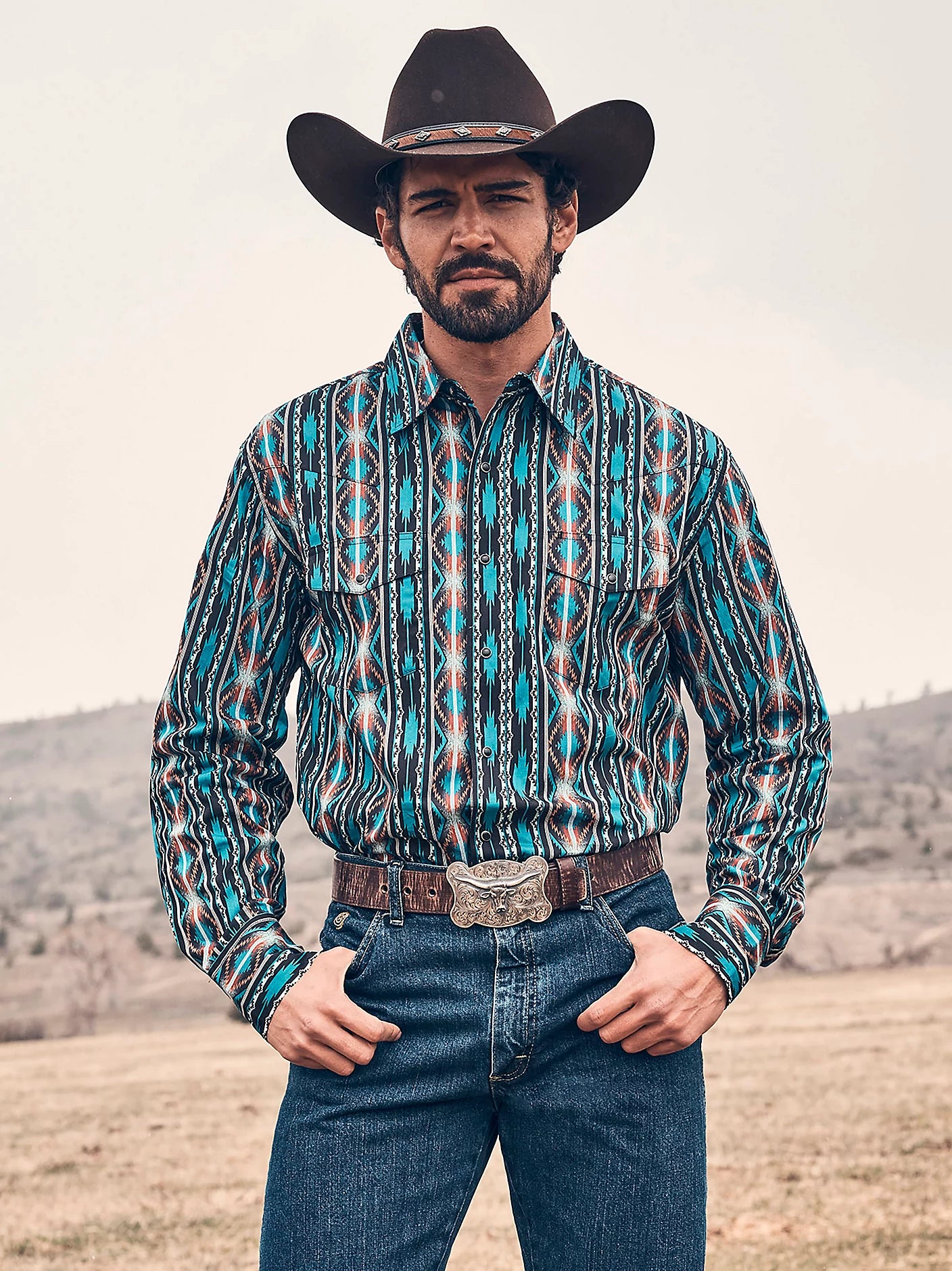 Wrangler's Checotah® has a home in the closets of cowboys around the world. This men's long-sleeve turquoise Navajo-inspired printed western snap shirt is designed to make a statement no matter the destination. It features a classic fit, a spread collar, pointed yokes, two single point snap flap pockets with a convenient pen slot, adjustable 3 snap cuffs, and a full-length pearl snap closure for the finishing touch. Best of all, it's crafted from cotton for uncompromising comfort. Look sharp at a moment's notice by wearing your Checotah shirt with a Wrangler Retro® or Cowboy Cut® jean.