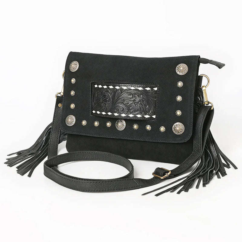 American Darling Genuine Suede Tooled Leather Inlay Fringe Crossbody Bag