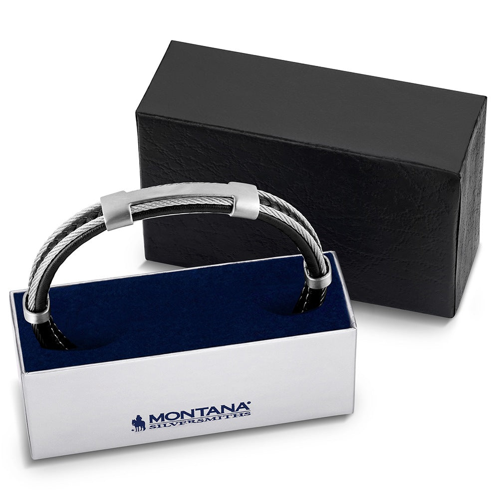 The Dust Country Bracelet blends rugged style with modern design, featuring silver and gunmetal tone stainless steel with genuine black leather accents. The contrasting materials create a striking contrasting design that is bold and unique. Its adjustable magnetic closure provides a secure and comfortable fit, while the sleek polished detailing makes it a versatile accessory for everyday wear. One size fits most.