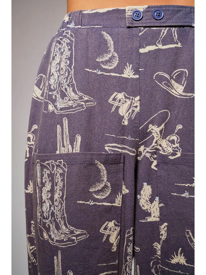 Add some whimsy to your wardrobe with these Western motif wide leg pants in washed navy. The relaxed fit, front patch pockets, and textured fabric make them perfect for a casual, comfortable look. And with elastic back waistband and button tab detailing, you'll have both style and ease.