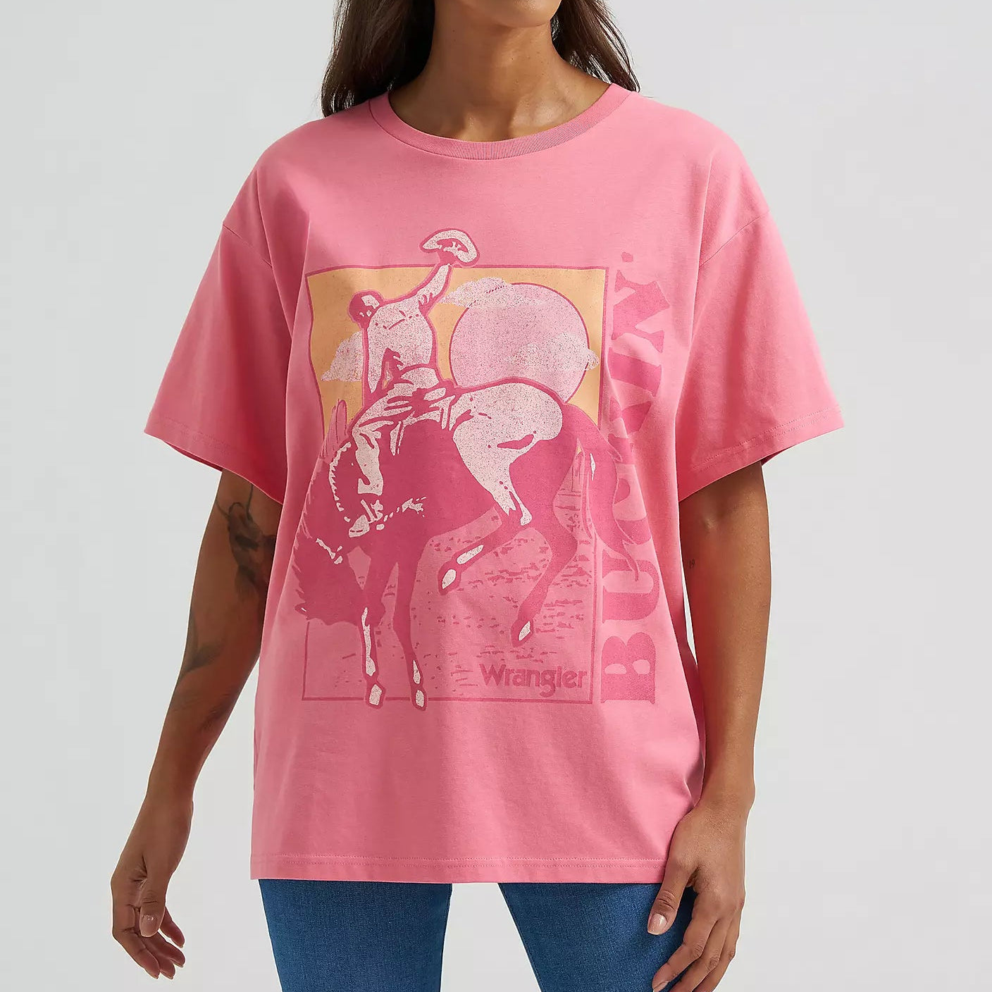 Our Women’s Buckin’ Bronco Oversized Tee embraces its wild side, in pre-faded pink with a fresh twist on our iconic mascot. It's cut is loose and long with dropped shoulders, giving it a lived-in look and feel. Nothing goes better with your Wrangler® denim than a classic crewneck.