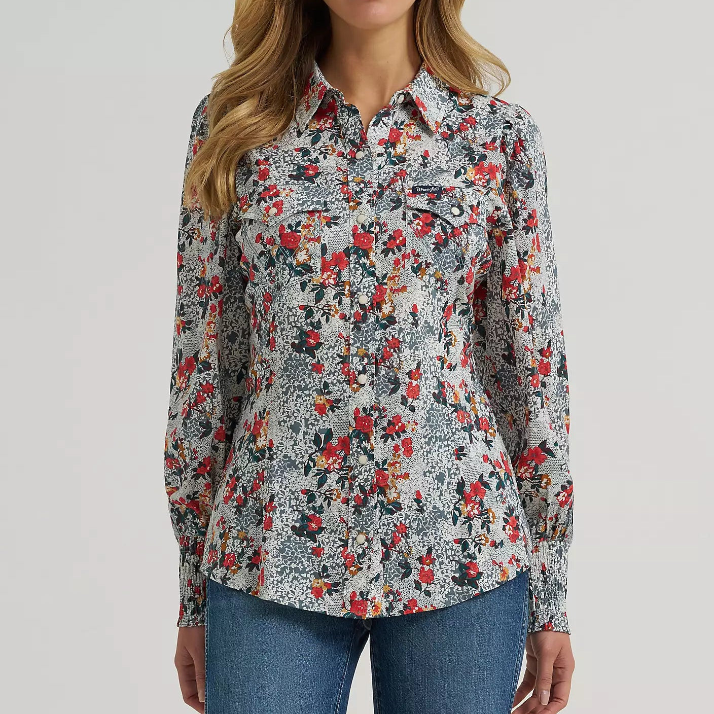Forever in season, the Women’s Wrangler Retro® Western Snap Slim Fit Blouse will add the perfect amount of vintage flair and colorful florals to your look. It features a figure-flattering silhouette that works solo or layered into your outfit, complete with puff sleeves and smocked cuffs. It’s finished with all the iconic details, including single-point yokes, chest pockets with the ‘W’ stitching, and pearl snaps, for a bold yet timeless style.