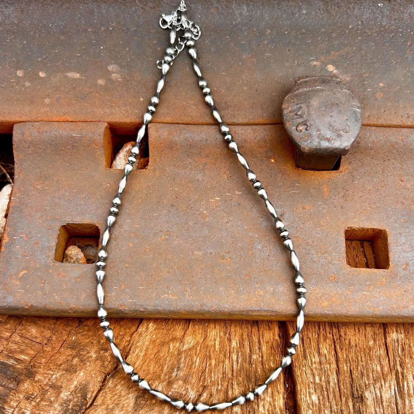 This unique 16" necklace puts a new twist on the traditional Navajo style pearl necklace. Handmade from sterling silver Navajo style pearls, intermixed with torpedo and teardrop sterling silver pearls, this dainty piece adds a little something different to your stack. The 3-4mm pearls are flanked by a clasp closure and 2.5" extender chain so you can customize the perfect length.
