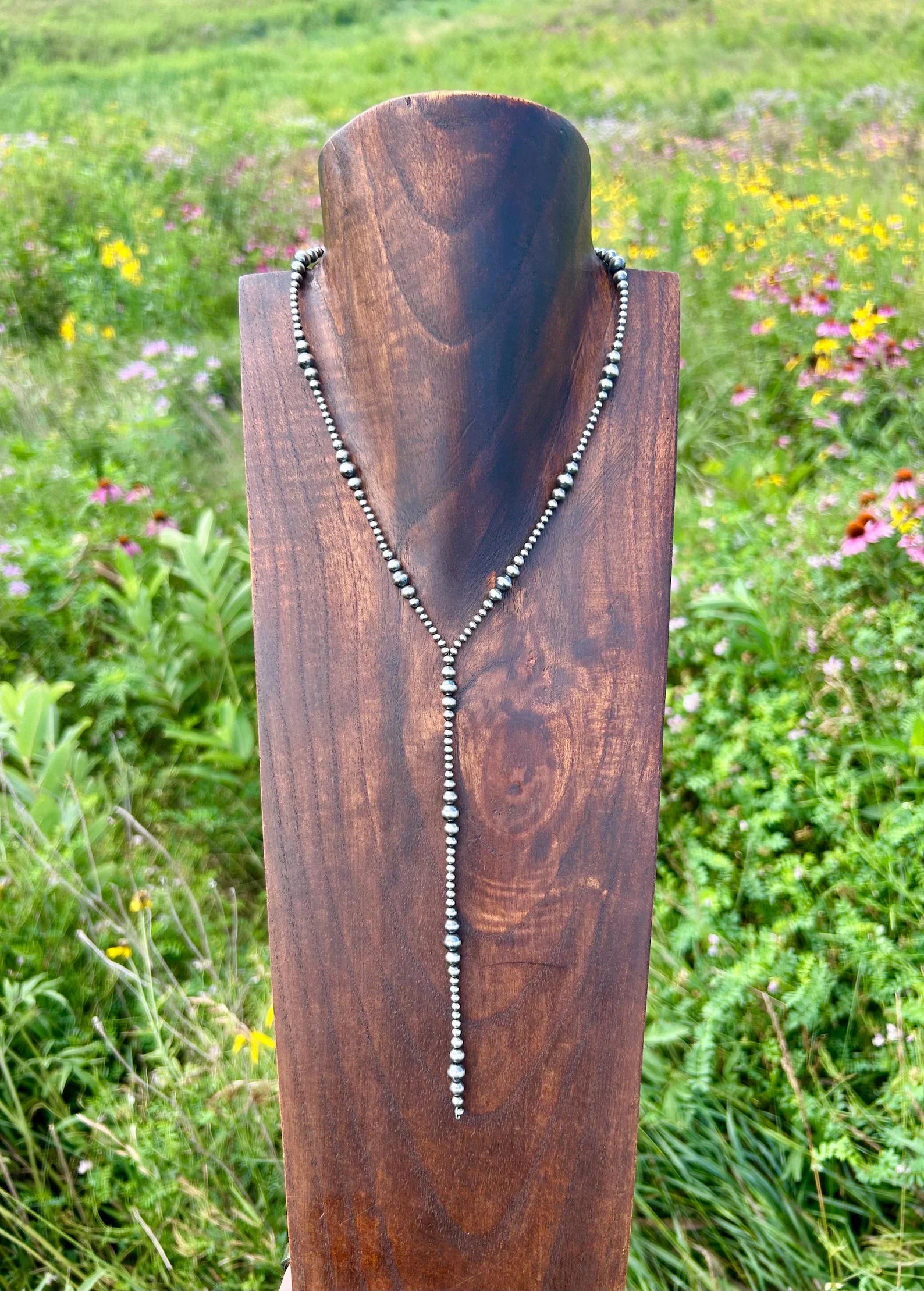 The perfect statement piece for all those v-neck tops!  This stunning 16" lariat necklace from Thunder & Stone is locally hand crafted from graduated 3mm-6mm sterling silver Navajo style Pearls.  A 2.5" extender at the clasp allows you to customize the length.  6" lariat drop.