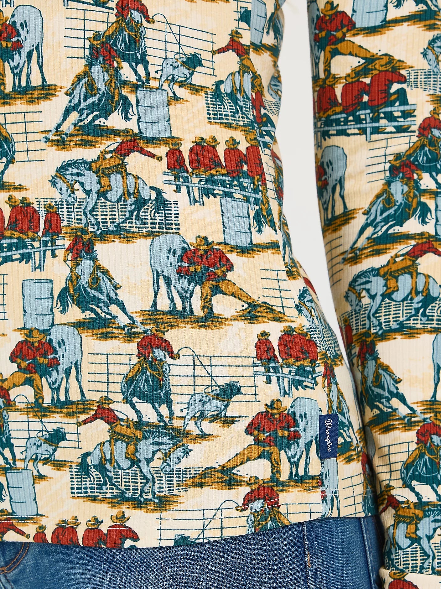 Take any outfit westward with a little giddy up from our Women’s Rodeo Print Mock Neck Shirt. It’s crafted from the softest fabric blend with just the perfect amount of stretch for a silhouette that hugs you in all the right places. This long-sleeve ribbed knit top comes with a colorful print of rodeo scenes.