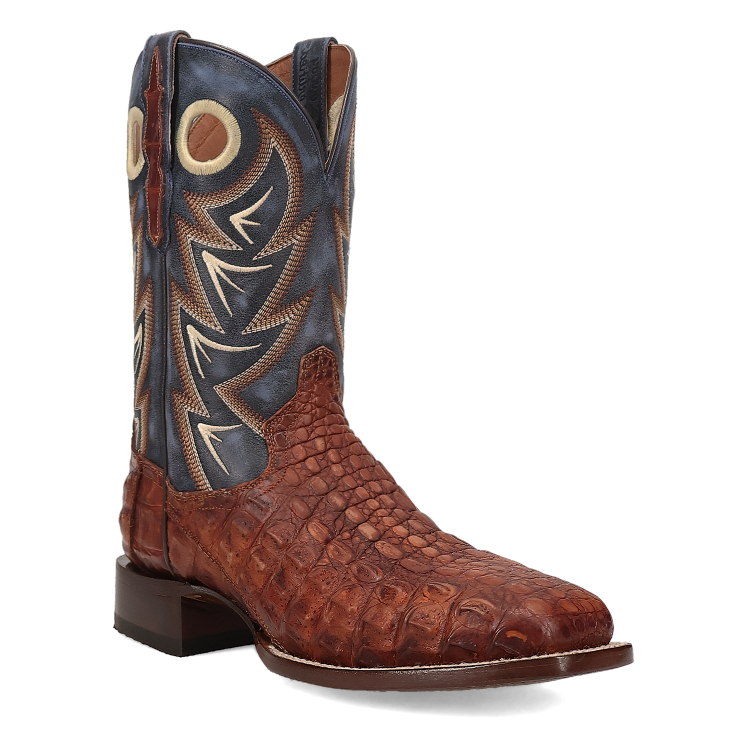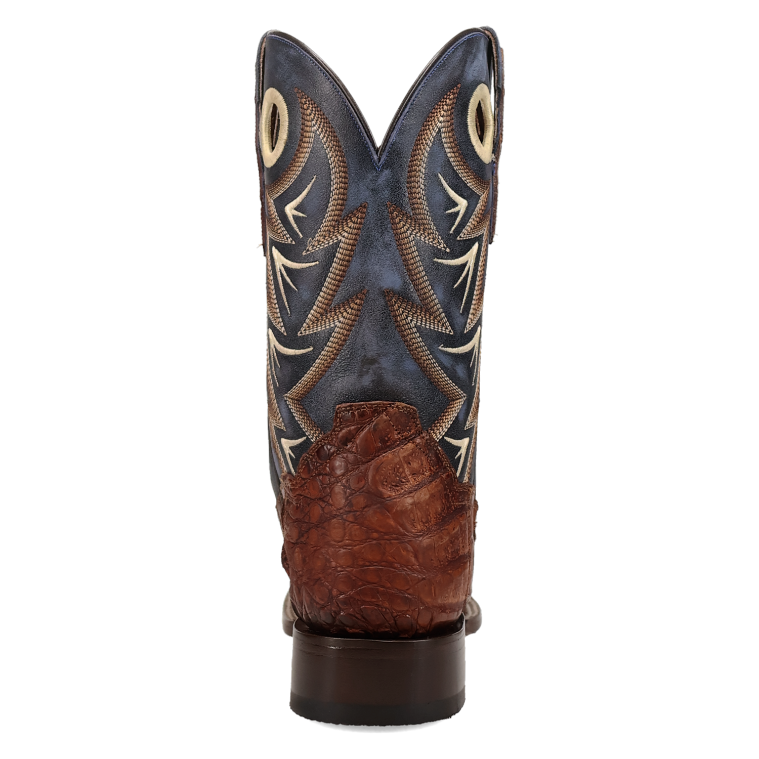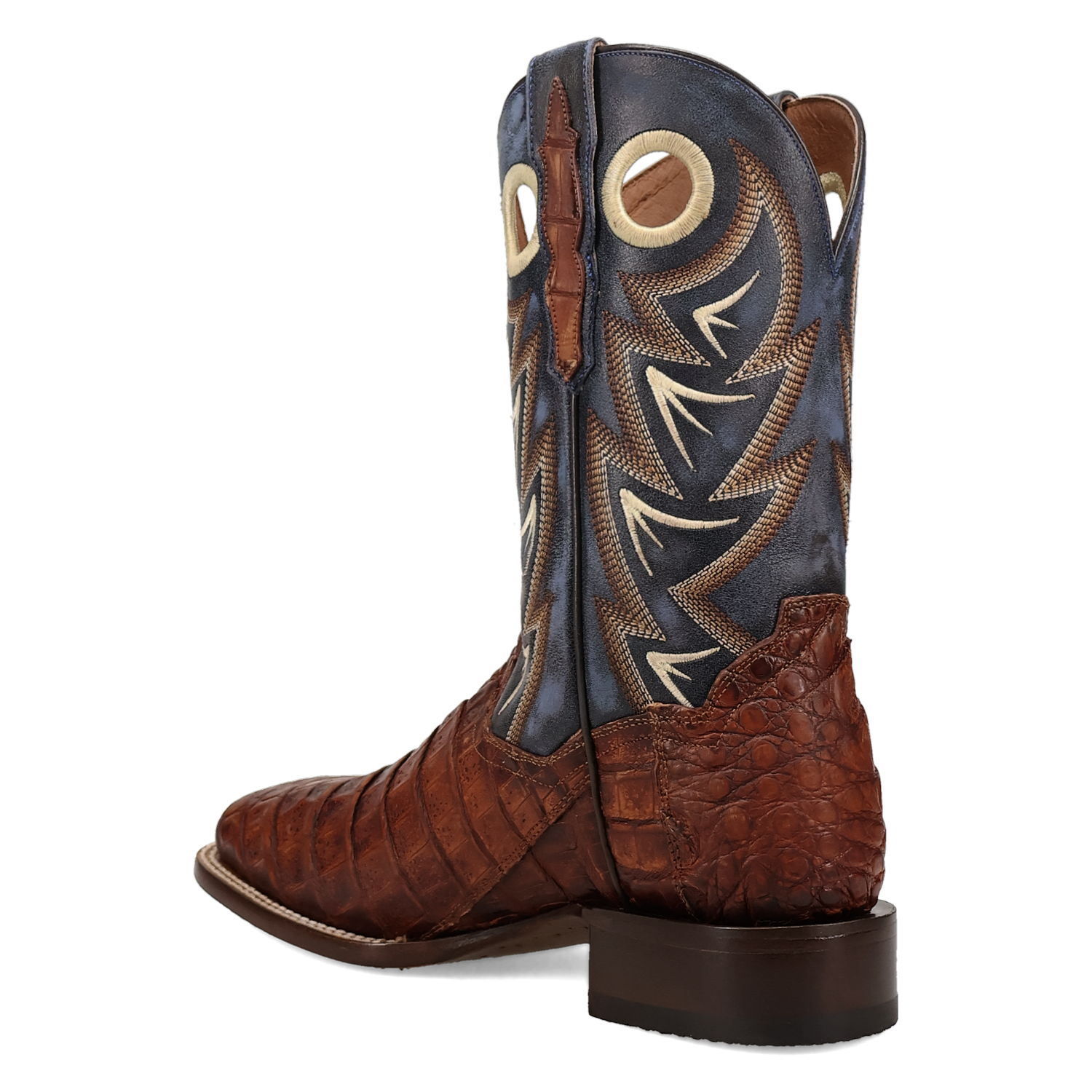 The Marsh pairs bold exotic character with everyday wearability. Crafted with a rich cognac caiman vamp and a striking blue 12” shaft, this men’s boot delivers standout Western style with a broad square toe and classic stockman heel. Built for comfort, it features a removable Soft Strike orthotic and a durable ROM2 rubber/leather outsole for reliable traction and long-lasting support.